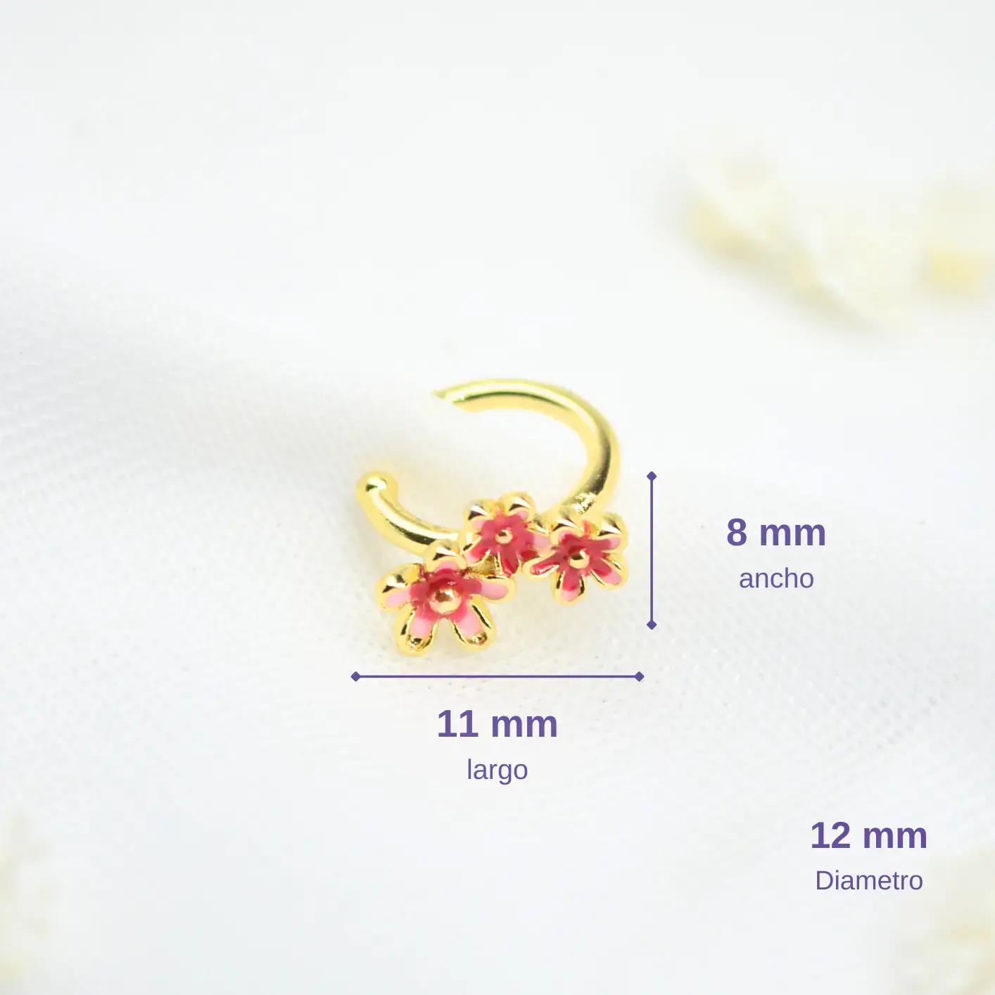 Esta pieza captura la esencia de la primavera en un diseño sutil y elegante. El earcuff consta de un aro dorado pulido que sirve de base para un hermoso trío de flores. Cada flor presenta pétalos definidos con un suave baño de esmalte rosado translúcido y un centro metálico que resalta su relieve. Su tamaño pequeño y diseño detallado lo convierten en el accesorio perfecto para quienes buscan un estilo romántico y naturalista. Es ideal para posicionar en la parte media del cartílago, aportando un toque de color suave que complementa otros accesorios básicos. Su estructura es ajustable, permitiendo un uso cómodo y seguro sin necesidad de perforaciones adicionales.