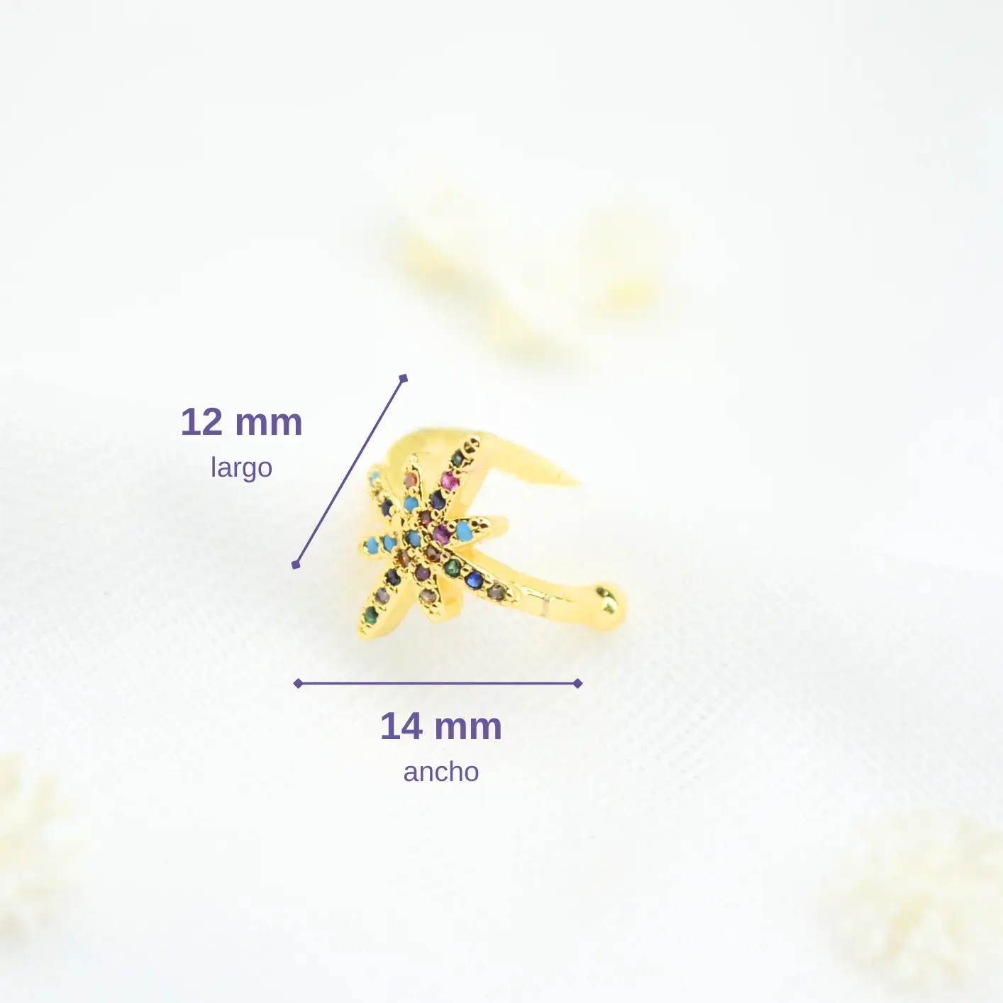Esta pieza evoca la magia del universo con un diseño audaz y contemporáneo. El earcuff presenta una estrella central de silueta asimétrica y estilizada, cuyas puntas están meticulosamente tapizadas con micro-circones en una vibrante paleta que incluye azul, verde, amarillo, fucsia y naranja. La base dorada realza el brillo de las gemas, creando un contraste lujoso que ilumina instantáneamente el rostro. Es el accesorio perfecto para llevar en el cartílago superior o medio, funcionando como una pieza única que no requiere perforación pero ofrece todo el impacto de una joya de diseñador. Su sistema de aro ajustable termina en una pequeña esfera lisa para garantizar máxima comodidad y un agarre seguro durante todo el día.