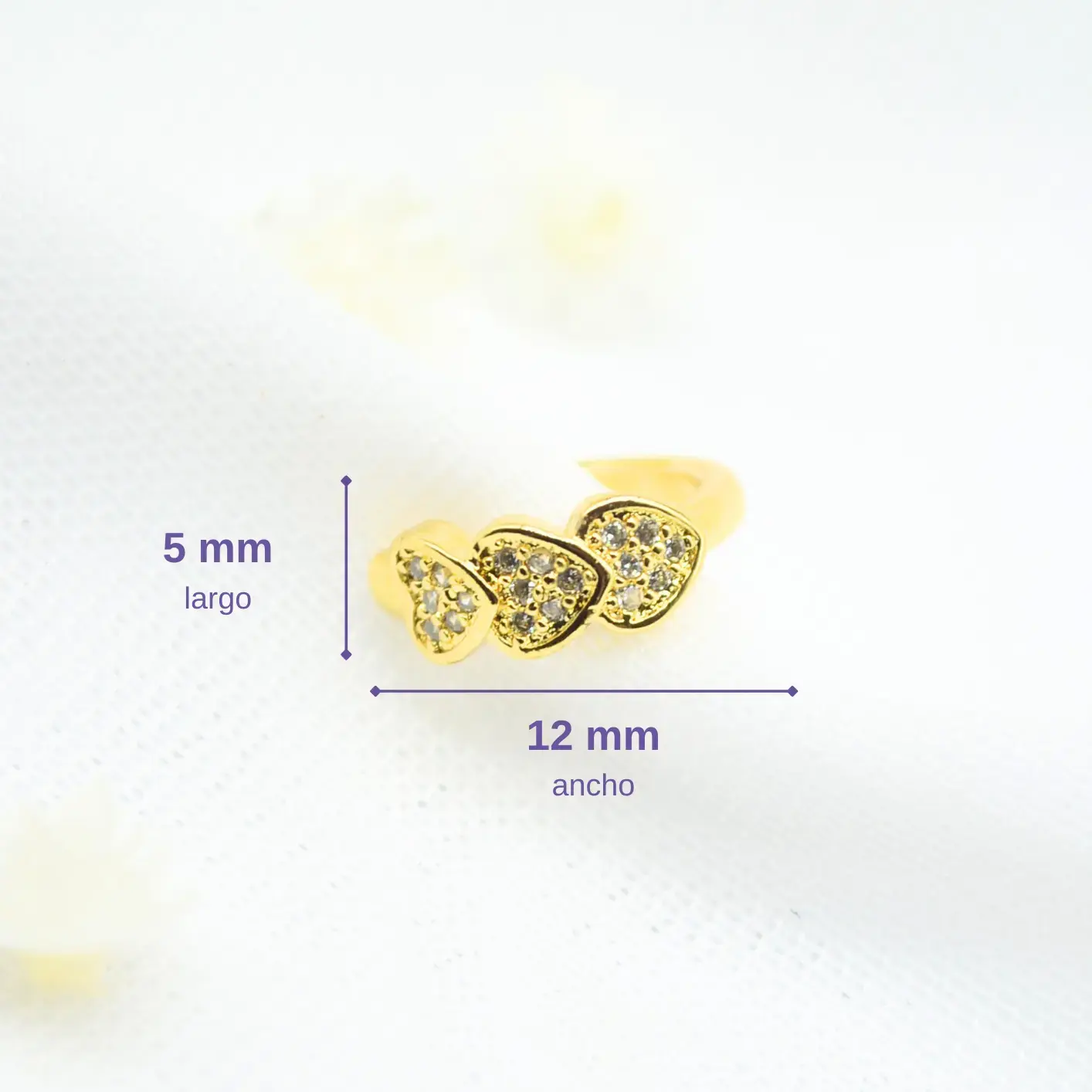 Esta pieza es una oda a la feminidad y al brillo clásico. El earcuff presenta una hilera frontal de tres corazones de tamaño uniforme, cada uno meticulosamente cubierto con micro-circones que crean una superficie de resplandor continuo. El acabado en rodio dorado resalta la blancura de las piedras, logrando un equilibrio perfecto entre elegancia y tendencia. Gracias a su diseño de aro ajustable y liso en la parte posterior, se desliza fácilmente sobre el cartílago, permitiendo lucir un estilo de múltiples perforaciones con una sola joya de gran impacto visual. Es el complemento ideal para un “look” romántico de noche o para elevar un atuendo casual con un detalle sofisticado.