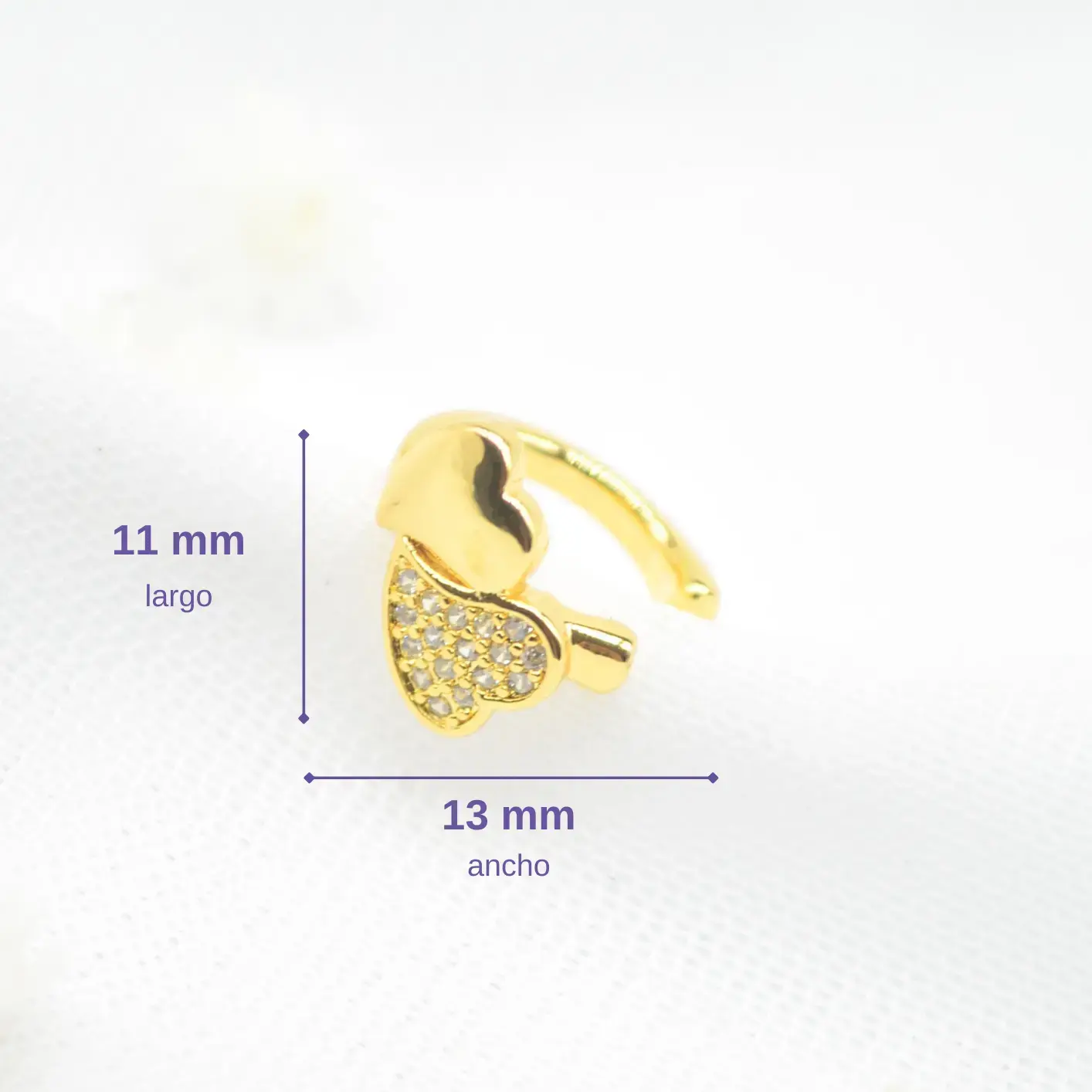 Esta pieza destaca por su armonioso equilibrio entre sencillez y sofisticación. El diseño presenta dos siluetas de corazón unidas en un solo cuerpo; el corazón superior posee un acabado liso y pulido de alto brillo, mientras que el corazón inferior está completamente engastado con micro-circones blancos que capturan la luz de forma espectacular. Su estructura dorada envuelve delicadamente el cartílago, creando un punto focal romántico y moderno que no requiere perforación. Es una joya versátil, perfecta para añadir un toque de brillo sutil a un conjunto diario o como parte de un estilo más elaborado para ocasiones especiales. Su aro ajustable asegura un ajuste personalizado y confortable.