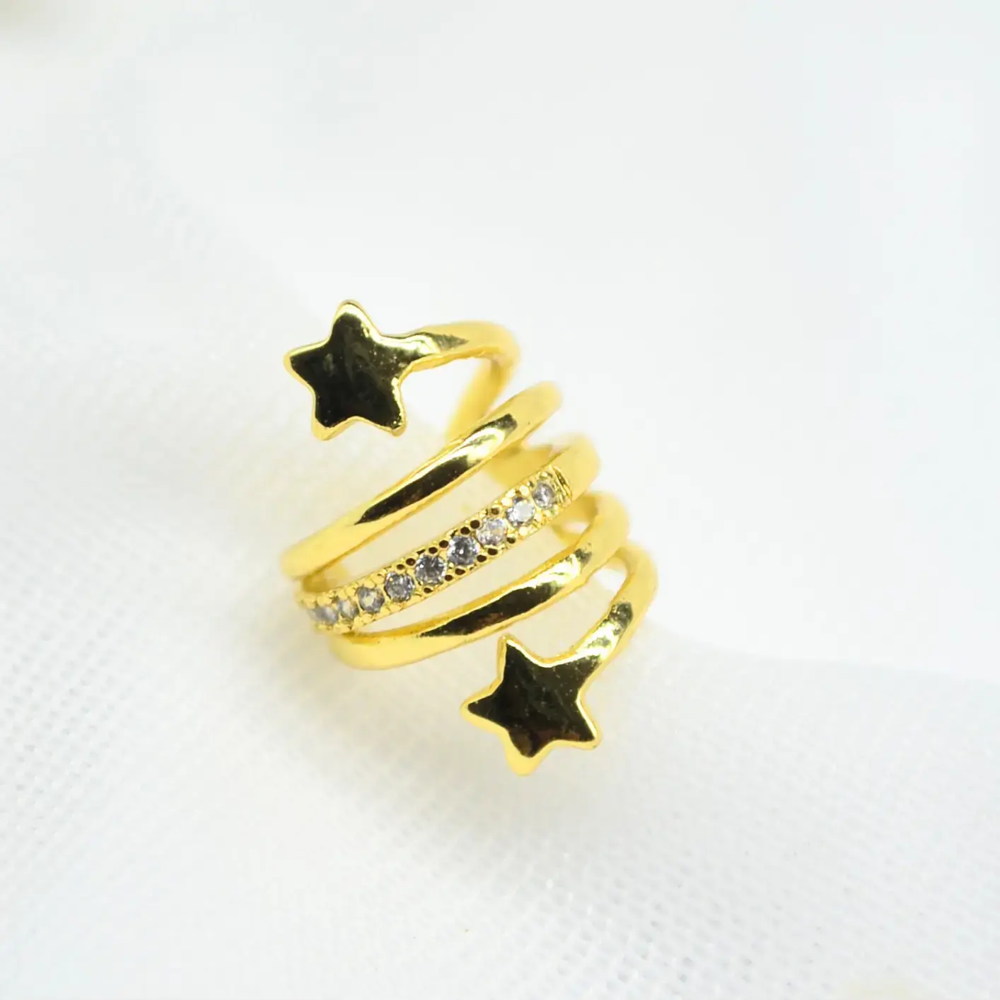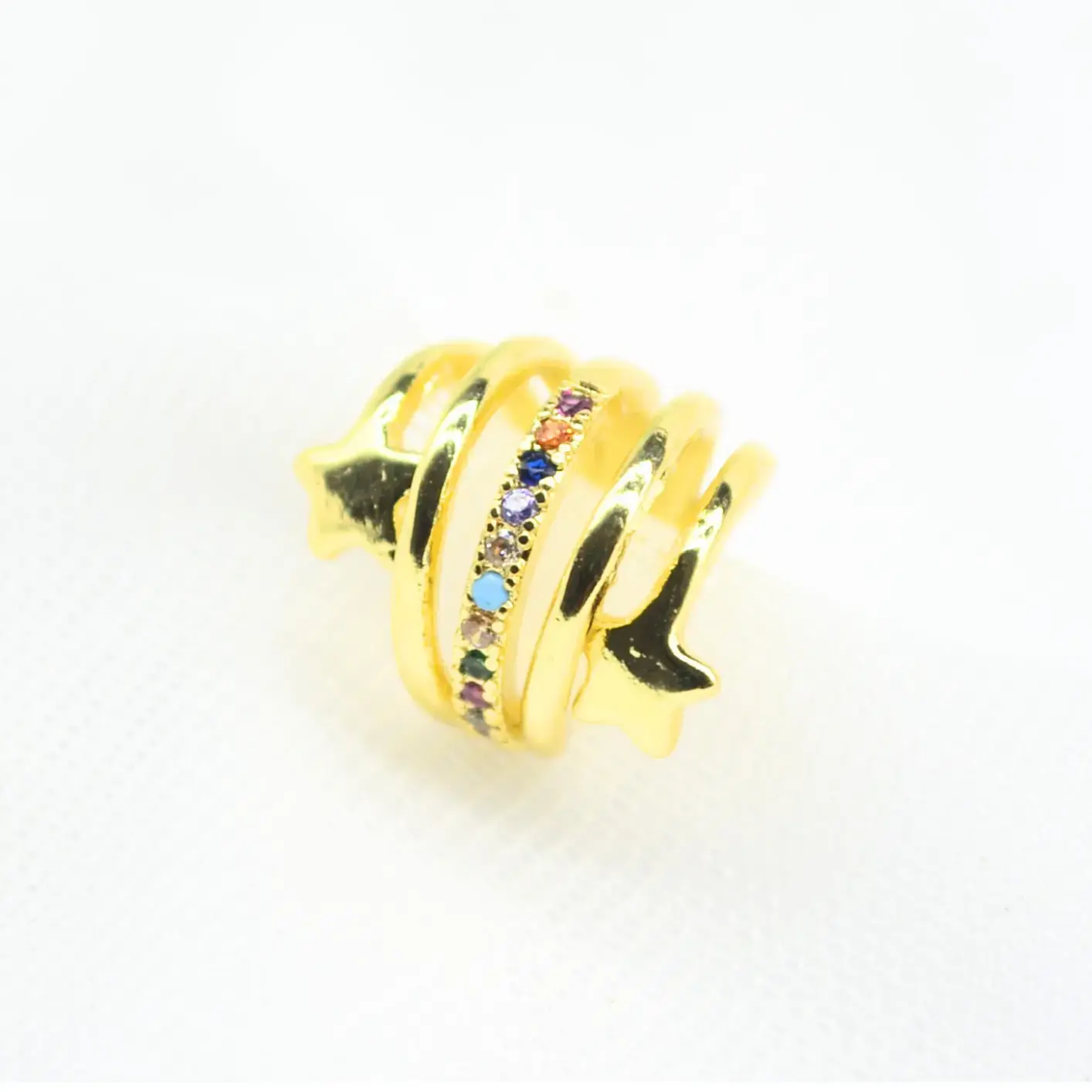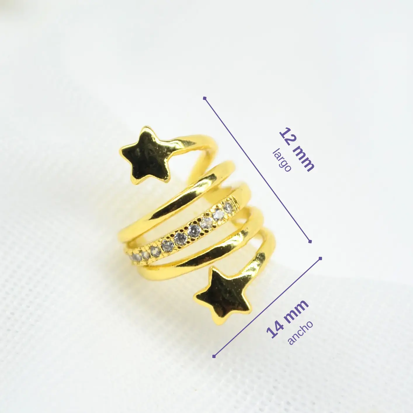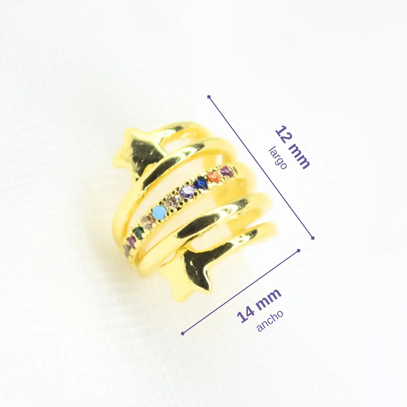 Esta pieza destaca por su estructura única de cuatro hilos que simulan múltiples perforaciones mientras se enroscan con gracia en el cartílago. Los extremos del earcuff están rematados con pequeñas estrellas de acabado pulido, mientras que uno de los aros centrales está completamente engastado con circones para añadir un toque de luz focal. Está disponible en dos variantes: una con circones en blanco cristal para un look elegante y atemporal, y otra con circones multicolores para un estilo más vibrante y lúdico. Es el accesorio ideal para quienes buscan volumen y un diseño temático que no pase desapercibido. Su cuerpo flexible permite ajustarlo a presión de manera sencilla, garantizando comodidad sin necesidad de perforación.